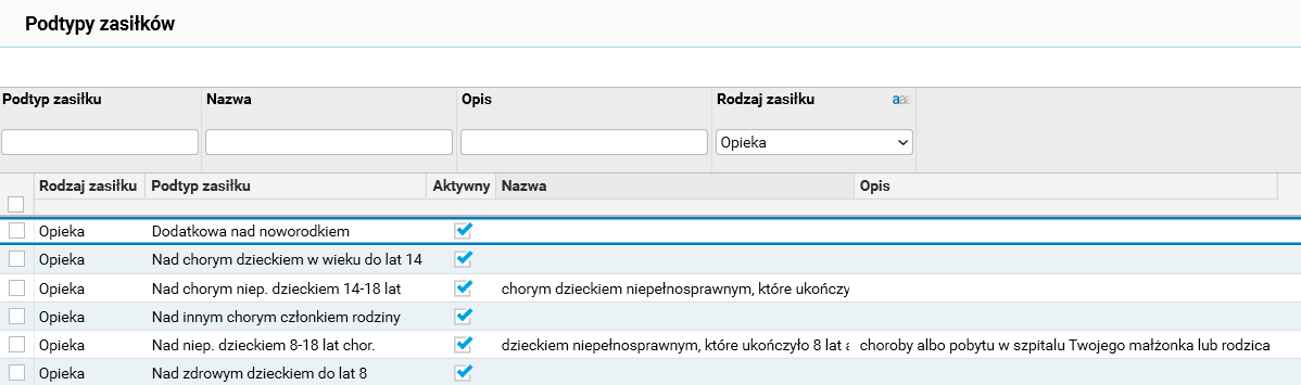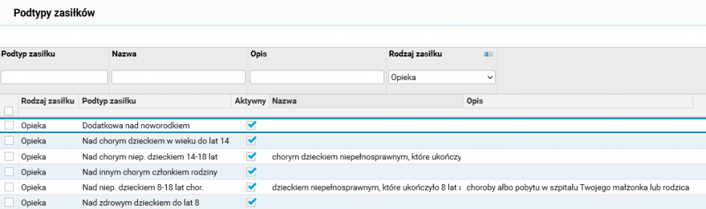 W związku z powyższym dla rodzaju zasiłku Opieka dodano dwa nowe podtypy zasiłku: