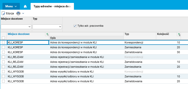 W słowniku Typy adresów – miejsca docelowe została dodana możliwość skonfigurowania kolejności, w jakiej adresy pracownika o poszczególnych typach eksportowane są do poszczególnych rodzajów adresów w kartotece kontrahentów.