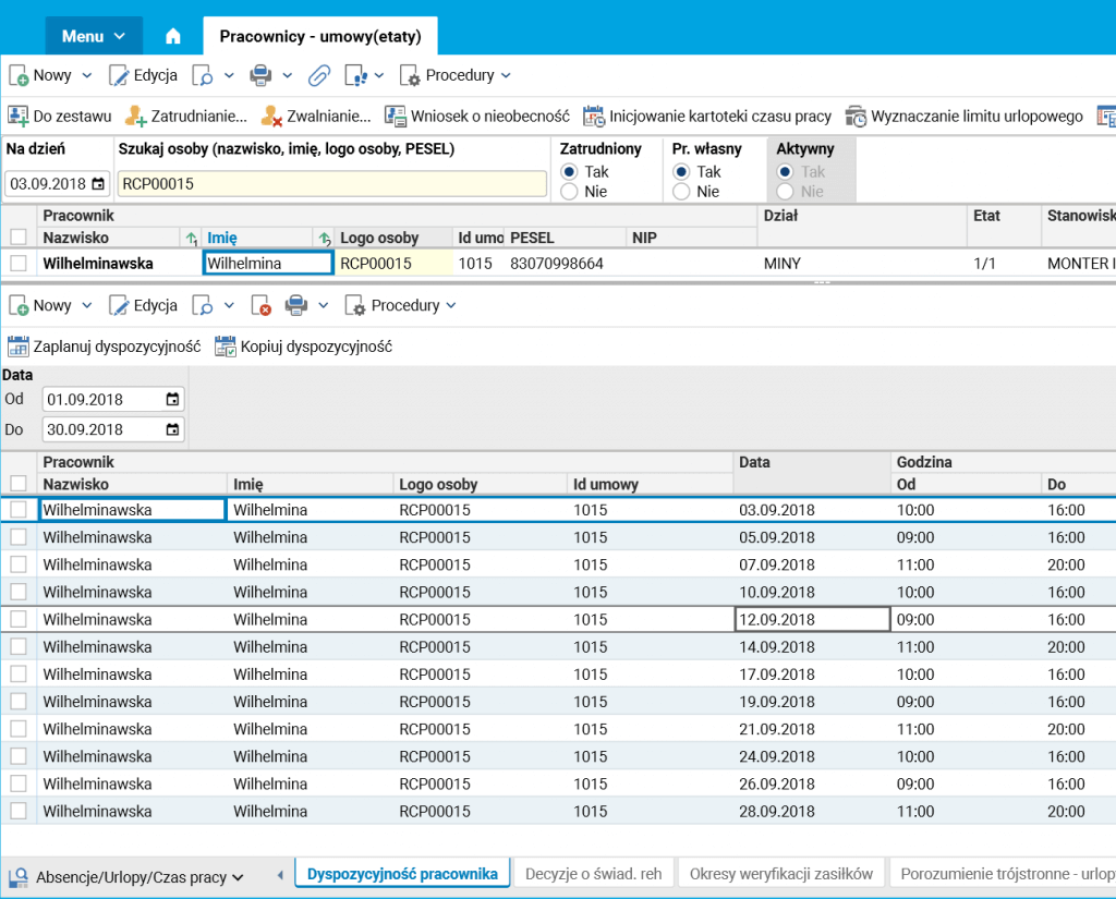 Przygotowana została nowa kartoteka z informacją o dyspozycyjności pracownika. Nowa kartoteka jest bardziej elastyczna i umożliwia szczegółowe podanie dostępności pracownika w wybranych dniach.