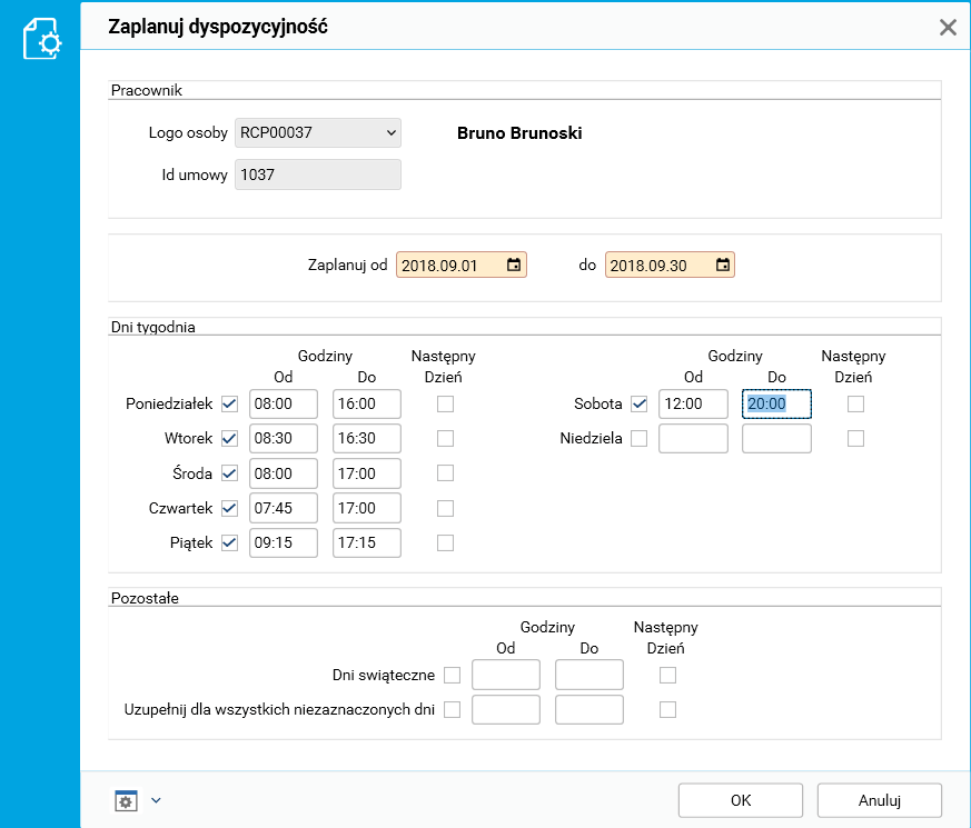 Procedura Zaplanuj dyspozycyjność służy do wskazania, kiedy pracownik jest dostępny, i jest uruchamiana dla zakresu dat wskazanego w polach Zaplanuj od i do.