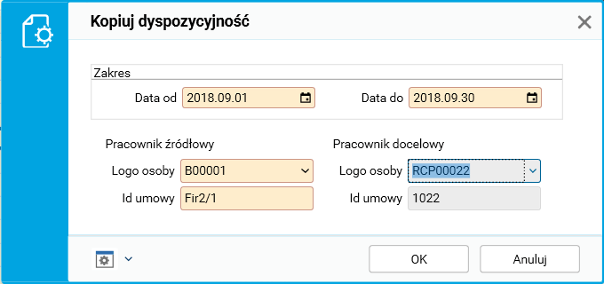 Dyspozycyjność zostanie skopiowana w zakresie dat podanych w polach Data od i Data do.