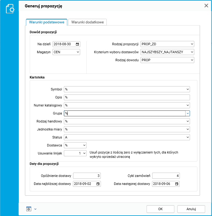 W celu usprawnienia generowania propozycji zamówień do dostawców wprowadzono możliwość zainicjowania pola Kryterium wyboru dostawców.