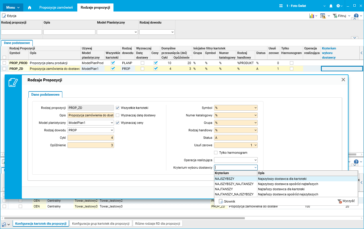 W tym celu w słowniku Rodzaje propozycji dodane zostało pole Kryterium wyboru dostawcy, które umożliwia przypisanie domyślnego kryterium wyboru dostawcy dla danego typu propozycji.