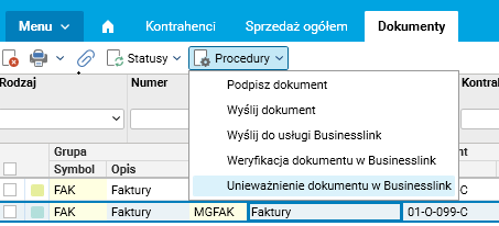 W systemie Softlab ERP by Asseco udostępniono procedurę umożliwiającą podjęcie próby unieważnienia e-dokumentu dostarczonego do Businesslink. Procedura nosi nazwę Unieważnienie dokumentu w Businesslink i jest osiągalna z poziomu słownika Dokumenty (edok_Dokumenty):