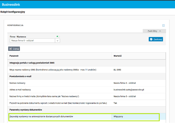 W usłudze Businesslink odbiorca dokumentów może od wersji 92 włączyć/wyłączyć parametr Zezwalaj wystawcy na unieważnianie dostarczonych dokumentów. Parametr jest dostępny z menu Administracja, oraz po wybraniu w masce Firma – Wystawca wystawcy, dla którego chcemy ustawić parametr (przy ustawieniu <USTAWIENIA GLOBALNE> parametr jest niewidoczny). Następnie należy kliknąć przycisk Zastosuj, odszukać parametr w siatce danych i zmienić jego wartość (przycisk Edytuj) na włączony/wyłączony w zależności od tego, czy chcemy, by wystawca dokumentu mógł zlecać proces unieważniania dokumentów. Uwaga! Domyślnie parametr ten jest włączony.