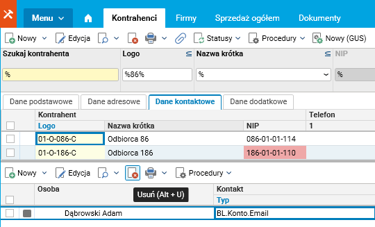Rys. Akcja Usuń, której użycie spowoduje usunięcie kontaktu w ERP i jednoczesną dezaktywacją powiązanego z konta w Businesslink