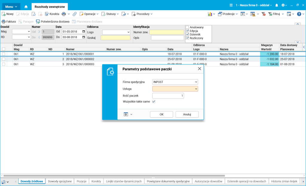 Usługi kurierskiej i paczkomatowej nie można mieszać, dlatego też gdy zbiorczo zmienimy status na Zarejestrowana dla dokumentów o różnych usługach, zostaną wydrukowane dwa oddzielne protokoły odbioru.
