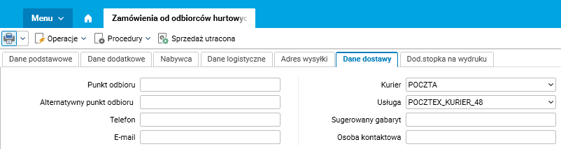 Rys. Formatka edycyjna słownika Zamówienia od odbiorców– zakładka Dane dostawy