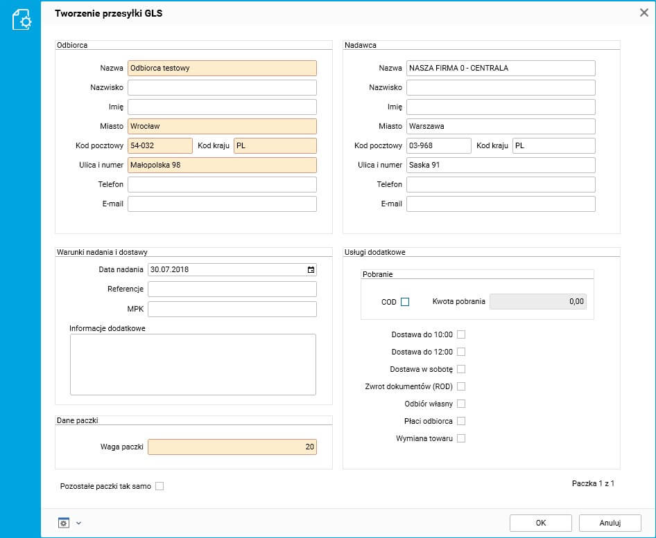 Rys. Formularz wprowadzania parametrów przesyłki GLS