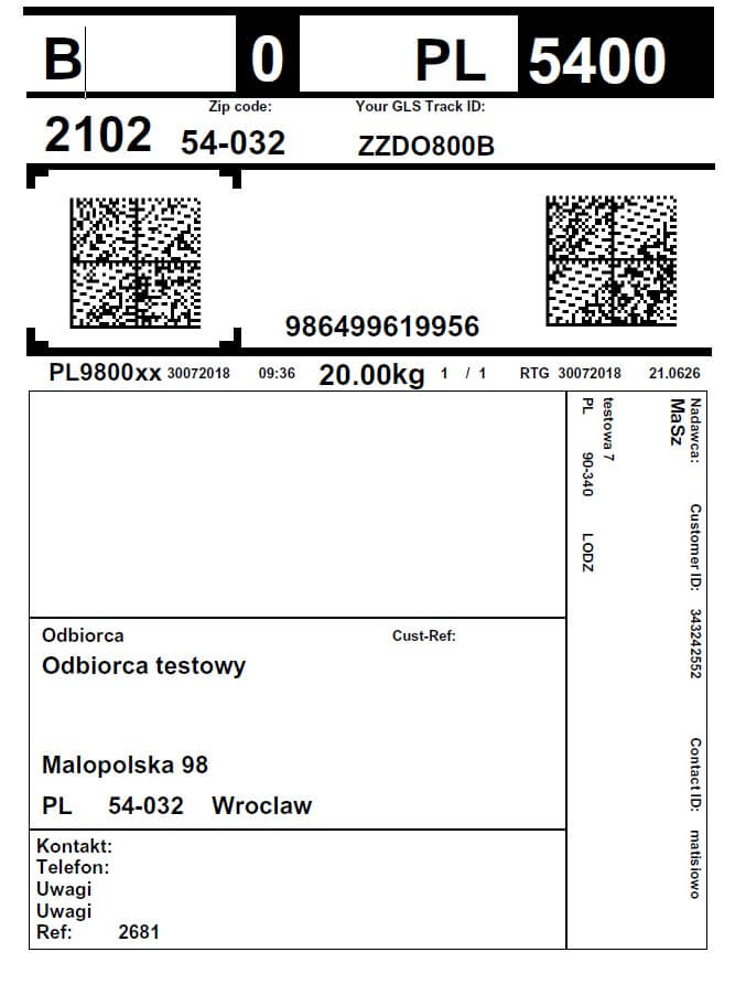 Po utworzeniu przesyłki istnieje możliwość wygenerowania etykiet adresowych na utworzone paczki kurierskie. Poniżej przedstawiona została testowa etykieta, którą zwraca system GLS.