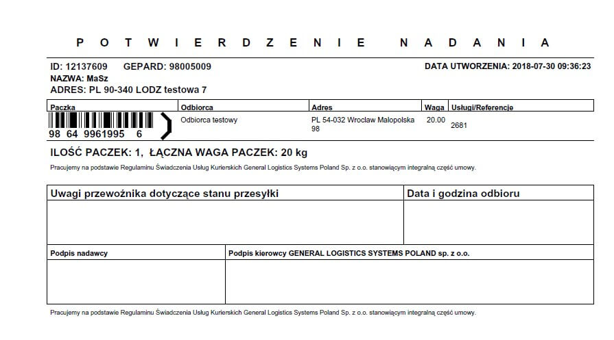 Po pobraniu etykiet mamy możliwość wygenerowania protokołu nadania paczek. Protokół może zawierać wiele przesyłek. Poniższy rysunek przedstawia wygenerowany protokół potwierdzenia nadania paczek GLS dla jednej przesyłki. Treść tego dokumentu również zwracana jest przez system kuriera.