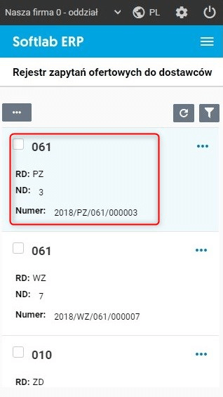 Na poniższym rysunku widzimy listę zapytań ofertowych do dostawców, w siatce danych (gridzie) wyświetlane są jedynie pierwsze cztery kolumny.