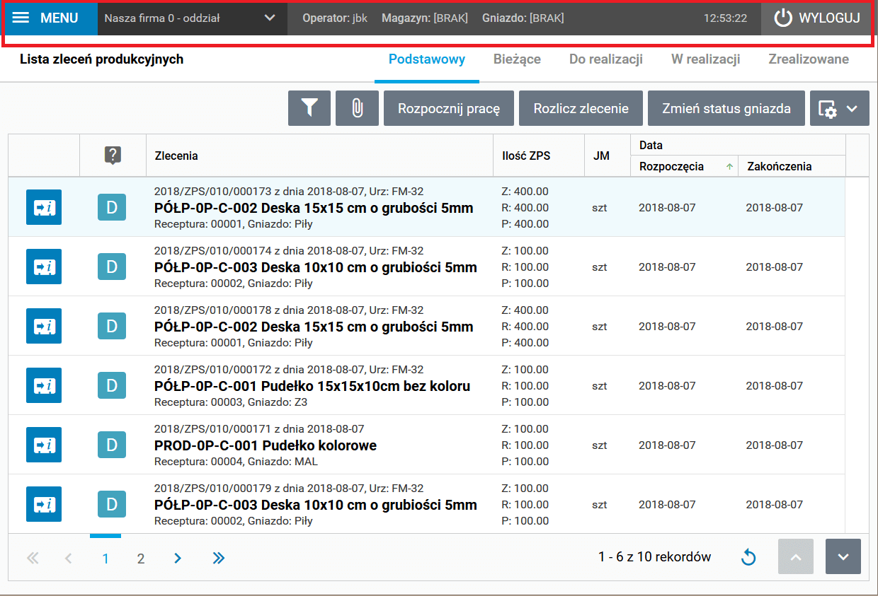 · Operator – informacja o zalogowanym operatorze, wybranym magazynie i gnieździe, jeśli gniazdo jest wybrane pojawi się również status gniazda produkcyjnego,