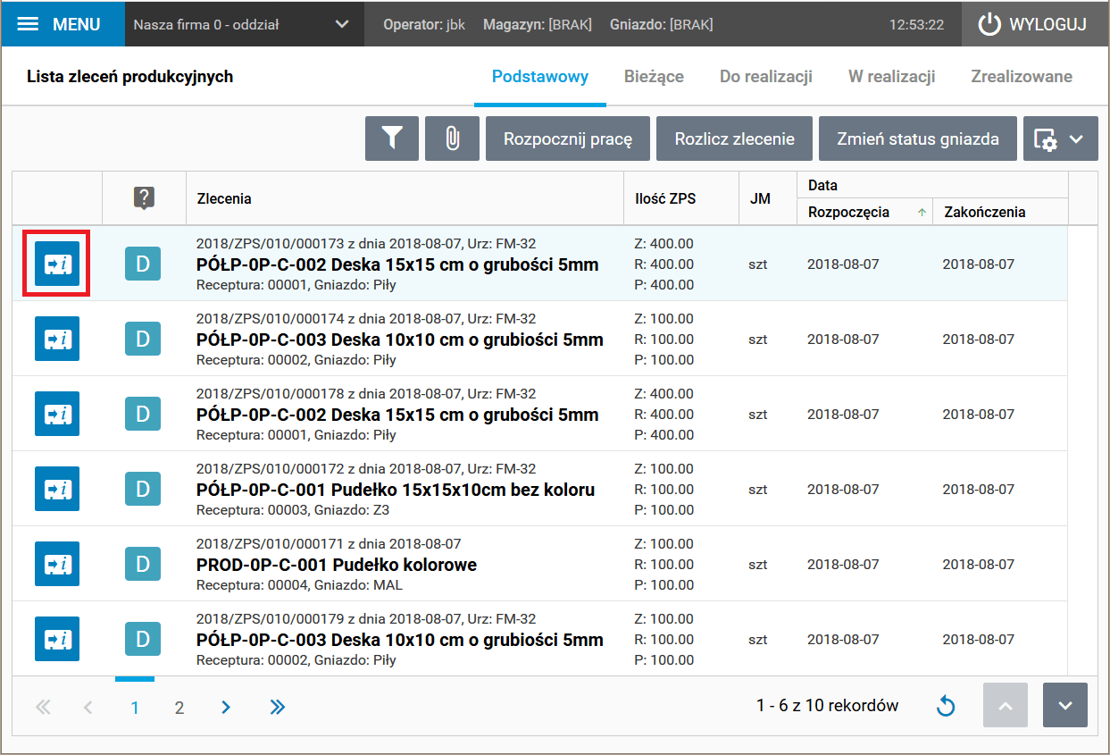 Rys. Ekran z listą zleceń produkcyjnych, przycisk przejścia do szczegółów zlecenia w pierwszej kolumnie