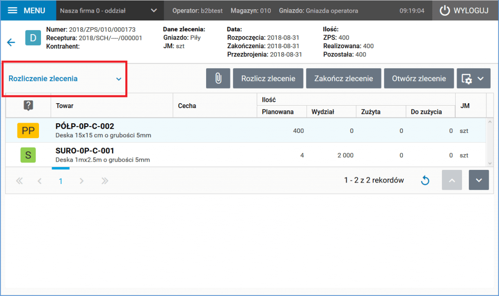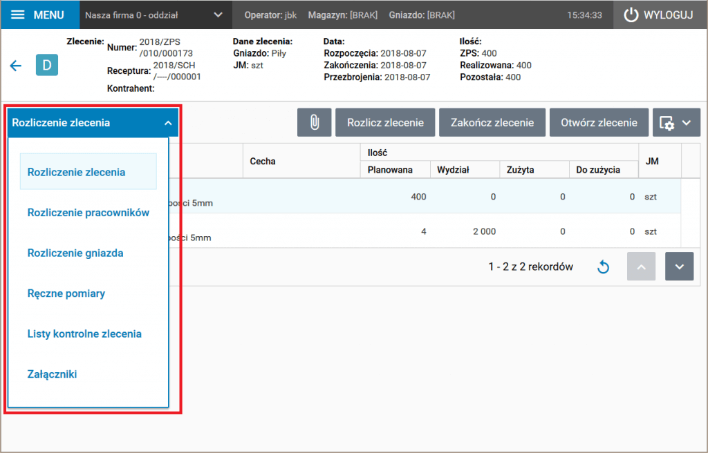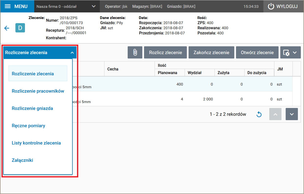 Szczegóły te pozwalają na rejestrację zdarzeń związanych z rozliczeniem produkcji (Rozliczenie zlecenia), rejestracją pracy operatora (Rozliczenie pracowników) czy też wykorzystaniem gniazda produkcyjnego (Rozliczenie gniazda). Kolejny szczegół (Listy kontrolne zlecenia) służy do obsługi list kontrolnych (tzw. checklist), w tym do manualnego pomiaru parametrów produkcji. Ostatni (Załączniki) daje dostęp do plików załączonych do zlecenia, np. dokumentacji technicznej lub pomiarowej.