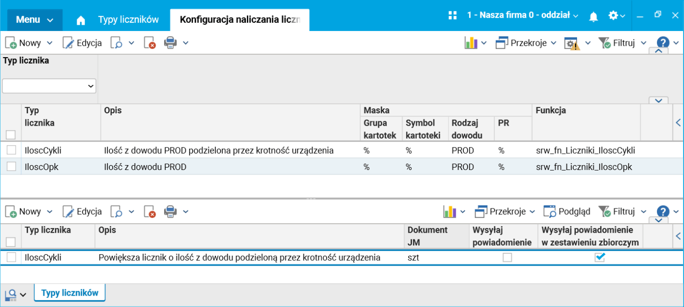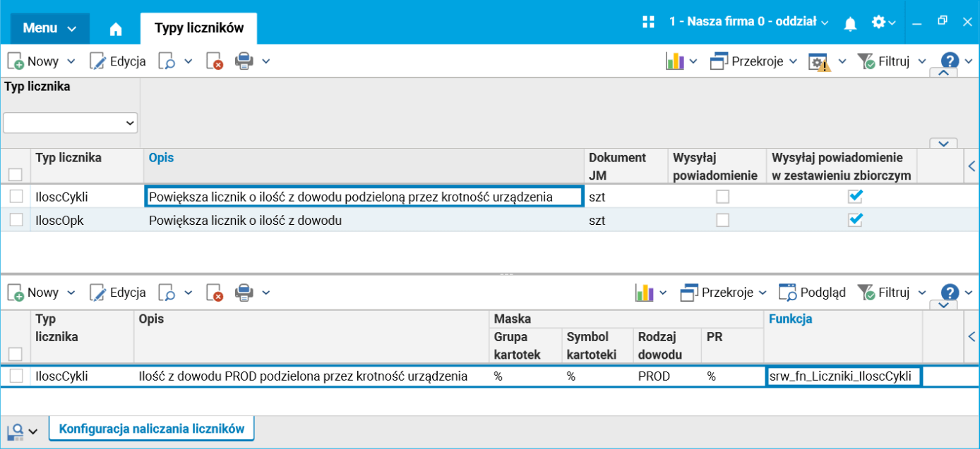 W definicji licznika należy określić, dla jakich grup kartotek materiałowych ma być używany, ewentualnie dla jakich kartotek oraz dla jakich rodzajów dowodów ma działać automatyczne wyznaczanie stanu licznika (za pomocą pól Maska określających dane na zasadzie filtru). Domyślnie licznik dostępny jest dla dowolnych kartotek materiałowych i rodzaju dowodu PROD.