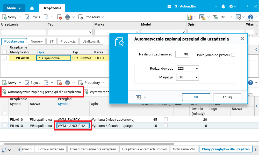 W tym celu zostało zmodyfikowane działanie procedury Automatycznie zaplanuj przegląd dla urządzenia generującej dokumenty zamówień zleceń serwisowych, dostępnej w słowniku Urządzenia, w szczególe Plany przeglądów dla urządzeń. Dzięki wprowadzonym zmianom możemy teraz generować dokumenty dla wskazanego przeglądu, a nie jak dotychczas – dla wszystkich przeglądów urządzenia.