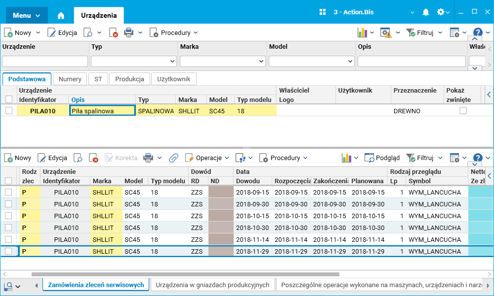 Zamówienia zleceń serwisowych wygenerowane dla wskazanego przeglądu można podejrzeć w słowniku Urządzenia, w szczególe Zamówienia zleceń serwisowych.