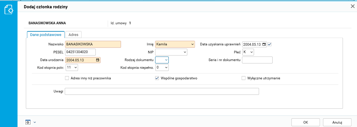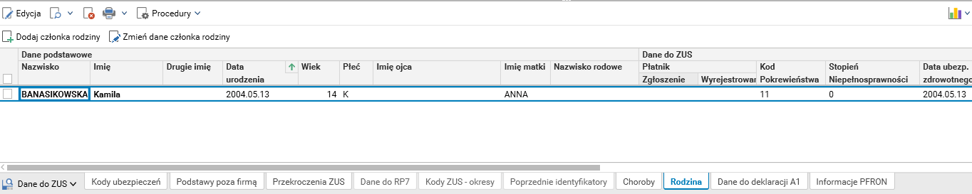 W słowniku Pracownicy – umowy(etaty) zapisujemy dane członka rodziny, podając jego datę urodzenia: