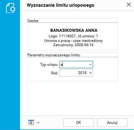 Podczas generowania limitu urlopowego dla urlopu typu „a” dla danego pracownika procedurą Wyznaczanie limitu urlopowego: