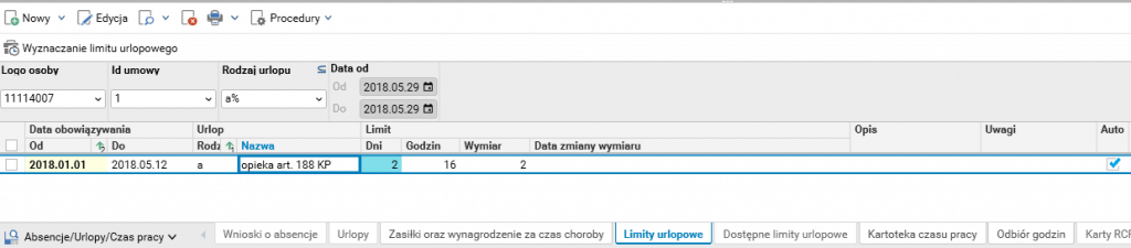 Funkcjonalność automatycznego generowania limitów dla urlopu typu „a” (Art. 188 KP).
