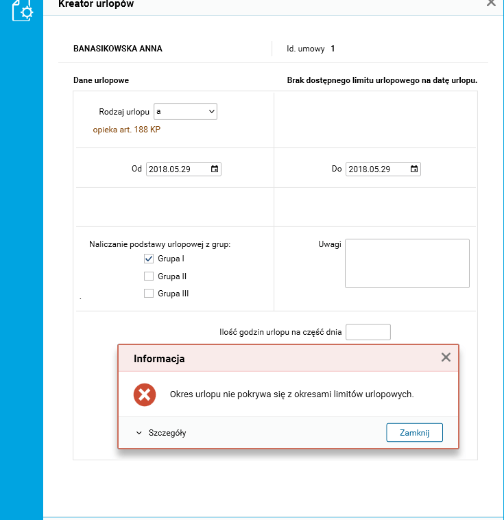 Przy próbie rejestracji urlopu „a” powyżej daty limitu pojawia się komunikat: