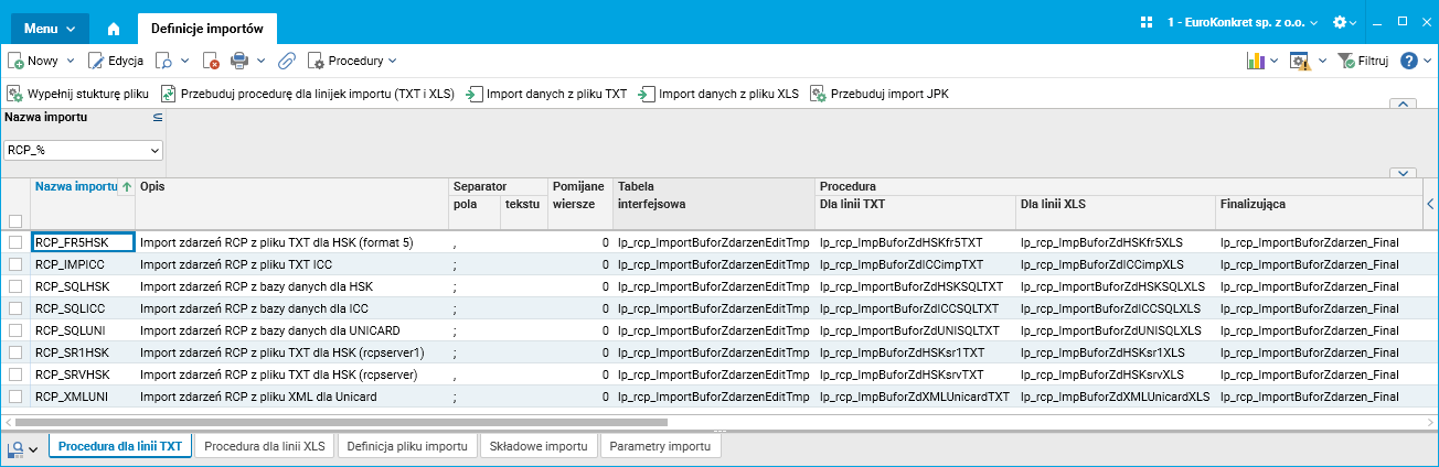 Konfiguracja importu zdarzeń RCP tworzona jest w słowniku Definicje importów. W przypadku posiadania przez przedsiębiorstwo rejestratorów dostarczanych przez producentów czytników firm Unicard, HSK oraz ICC dostępne są standardowe definicje importu z plików lub z zewnętrznej bazy danych.