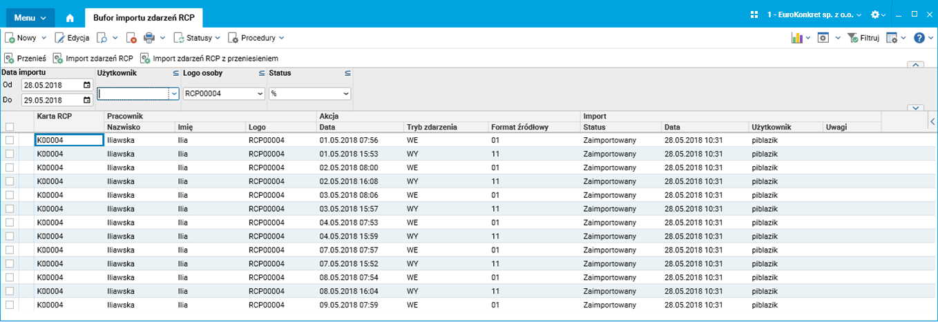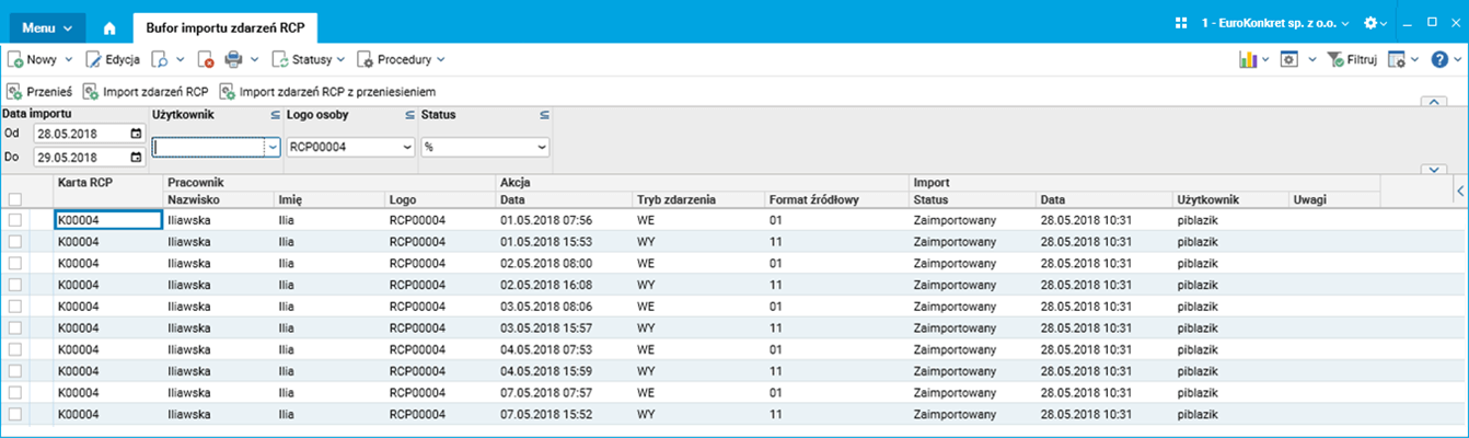 Wszystkie powyższe działania dotyczą konfiguracji i wykonuje się je raz na etapie wdrożenia funkcjonalności importu. Zdefiniowane zadanie cykliczne odpowiada za uruchomienie importu danych z zewnętrznej bazy do bufora w słowniku Bufor importu zdarzeń RCP. Zadanie aktywuje import zgodnie z harmonogramem, każdego dnia co godzinę. W trakcie importu dane podlegają weryfikacji, a następnie oczekują w buforze na przeniesienie do docelowej kartoteki zdarzeń pracowniczych w słowniku Zdarzenia RCP. Przykładowe zdarzenia są w statusie Zaimportowany, co oznacza, że nie zawierają one błędów: