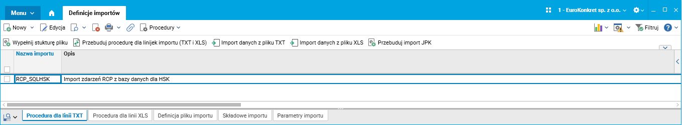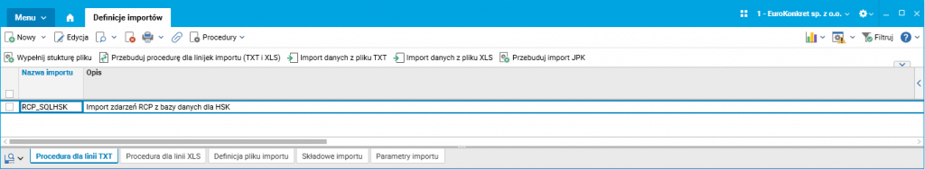 Ustalono, że dane będą pobierane z zewnętrznej bazy danych automatycznie, z wykorzystaniem mechanizmu standardowej definicji importu o nazwie RCP_SQLHSK dostępnej w słowniku Definicje importów: