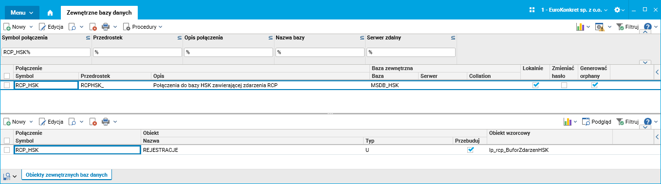 Rys. 4. Konfiguracja połączenia z bazą danych dla rejestratorów HSK w słowniku Zewnętrzne bazy danych