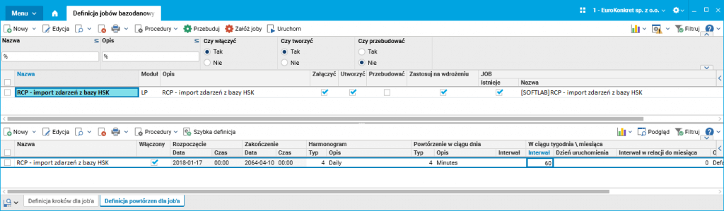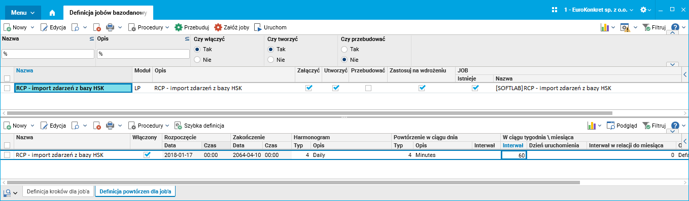 Następnie należy utworzyć cykliczne zadanie (tzw. job) w słowniku Definicja jobów bazodanowych, które odpowiada za uruchomienie importu zdarzeń RCP z zewnętrznej bazy danych rejestratorów HSK do słownika Bufor importu zdarzeń RCP: