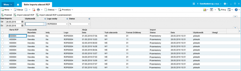 Ustalono, iż w celu weryfikacji czasu pracy przez bezpośrednich przełożonych, raz dziennie osoba odpowiedzialna za sprawdzenie stanu bufora przeniesie dane ze słownika Bufor importu zdarzeń RCP do docelowej kartoteki zdarzeń w słowniku Zdarzenia RCP. W tym celu operator zaznacza wybrane wiersze ze statusem Zaimportowany i uruchamia procedurę Przenieś. Status wierszy w buforze zmienia się na Przeniesiony: