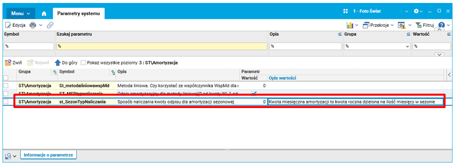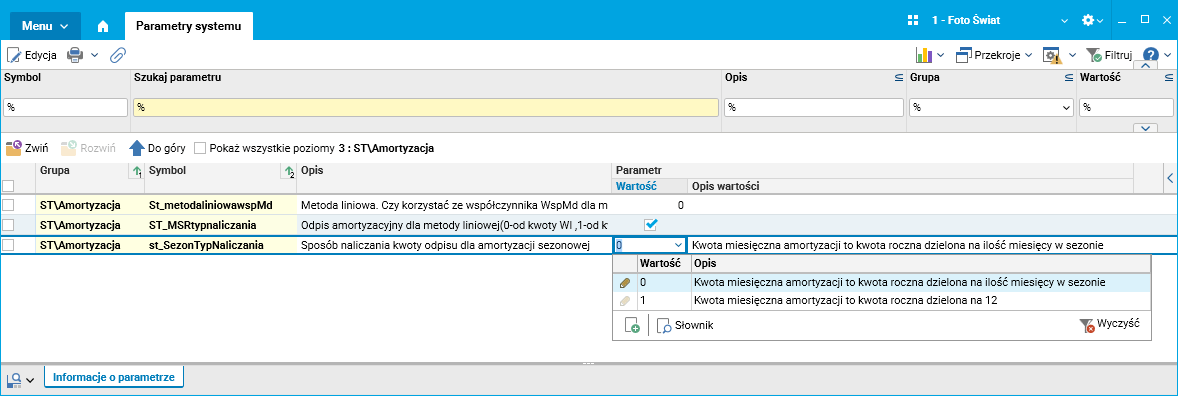 Do systemu wprowadzone zostały zmiany, które umożliwiają wybór sposobu naliczania amortyzacji dla środków trwałych wykorzystywanych sezonowo. W tym celu w aplikacji dodany został parametr st_SezonTypNaliczania dostępny w słowniku Parametry systemu (w grupie STAmortyzacja), który może przyjmować dwie wartości:
