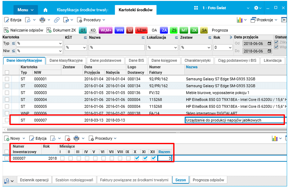 Uwaga! W każdym roku, w którym amortyzowany jest dany środek trwały, należy odrębnie wskazać miesiące stanowiące sezon.