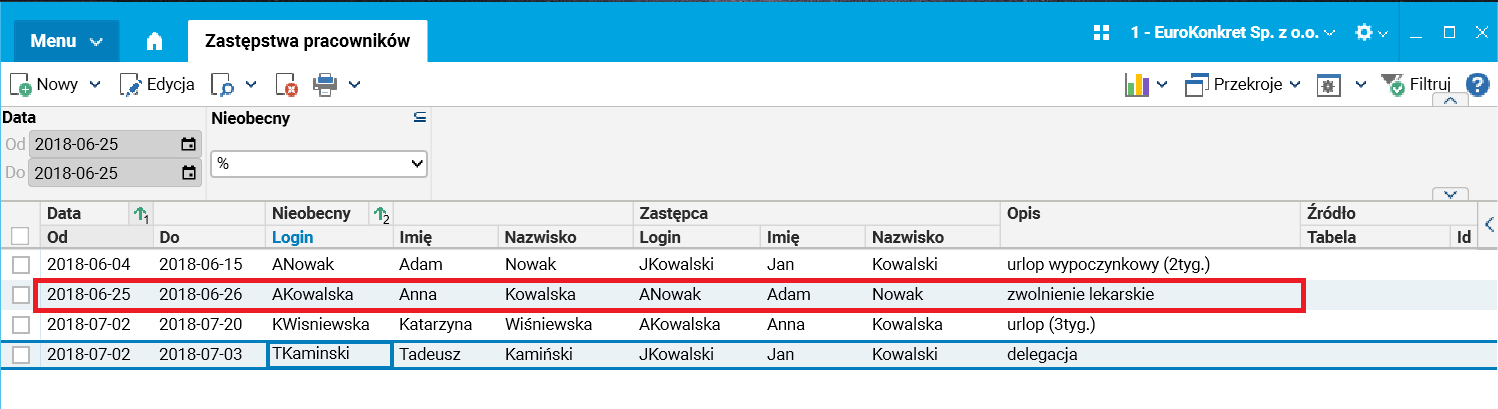 Absencja pracownika, wraz ze wskazaniem osoby zastępującej, automatycznie pojawi się tutaj, jeśli została zarejestrowana w systemie HR.