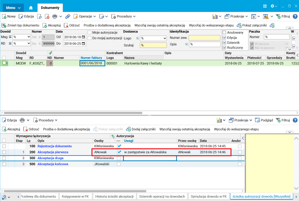 Podczas generowania ścieżki akceptacji na dokumencie system uwzględnia informacje podane w słowniku zastępstw, i jeśli znajdzie w nim osobę nieobecną w danym dniu, to wygeneruje ścieżkę dla osoby zastępującej.