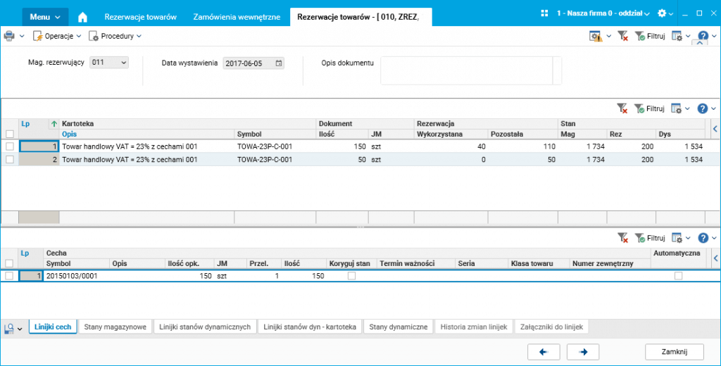 Struktura samego dowodu ZREZ jest bardzo przejrzysta – wskazuje w szczególności magazyn, na rzecz którego wprowadzona została rezerwacja, oraz pozycje i ilości, które podlegają rezerwacji. Co ważne, rezerwacja taka może być przeprowadzona z dokładnością do cechy, dzięki czemu możliwe jest alokowanie np. końcówek serii do wybranego sklepu.