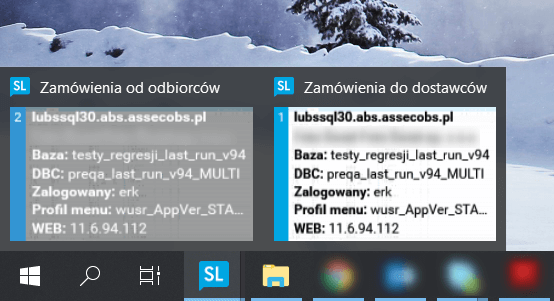 Gdy użytkownik ma otwartych wiele okien, to po umieszczeniu wskaźnika myszy na ikonie aplikacji Softlab w pasku zadań Windows pokazuje się lista otwartych okien w postaci miniatur. Tytuł miniatury wskazuje aktywną zakładkę w danym oknie.