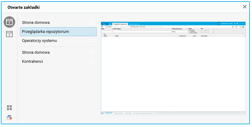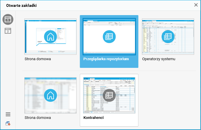 W panelu po lewej stronie mamy listę otwartych okien. Podświetlony element wskazuje, do którego okna należy aktualnie wybrana zakładka w głównej części okna przełączania zakładek.