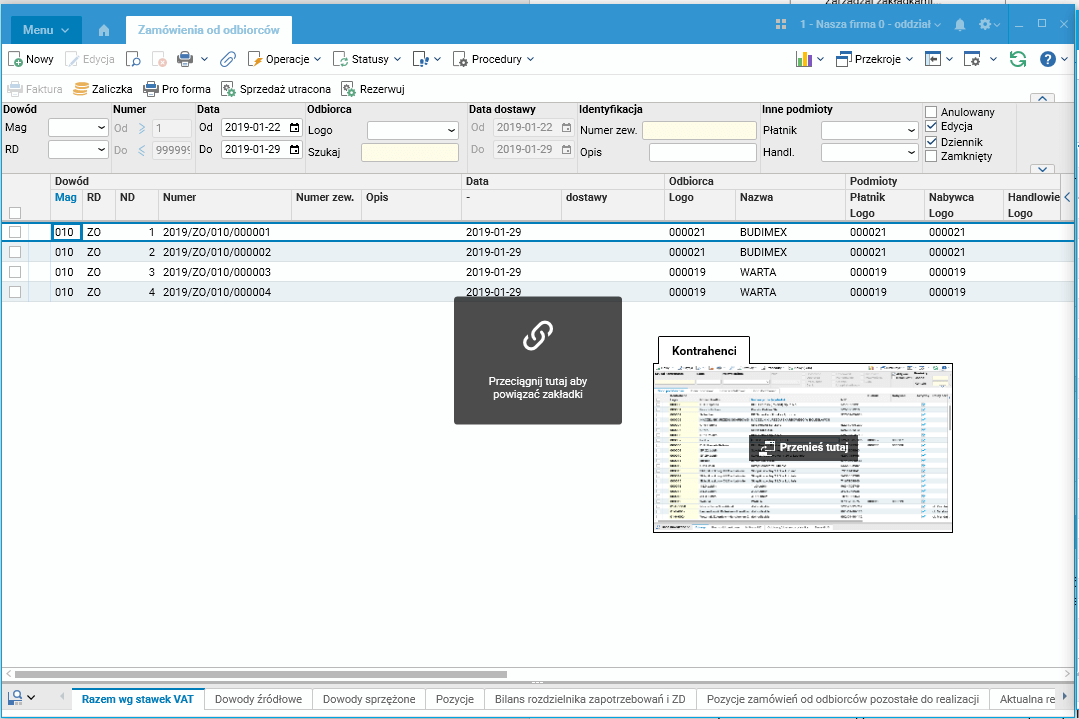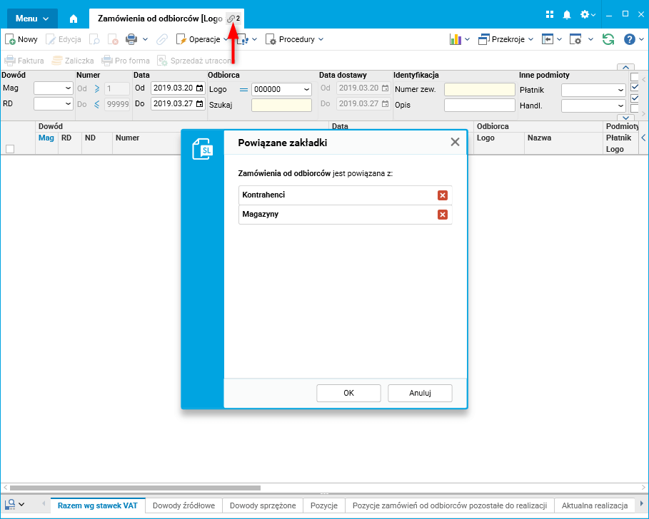 Istnieje też możliwość łączenia słowników, np. uzależnienie słownika Sprzedaż ogółem od słownika Kontrahenci. Taka relacja będzie polegała na tym, że wyszukanie kontrahenta w słowniku Kontrahenci sprawi, że w słowniku Sprzedaż ogółem odfiltrują się dokumenty sprzedaży dla tego klienta.