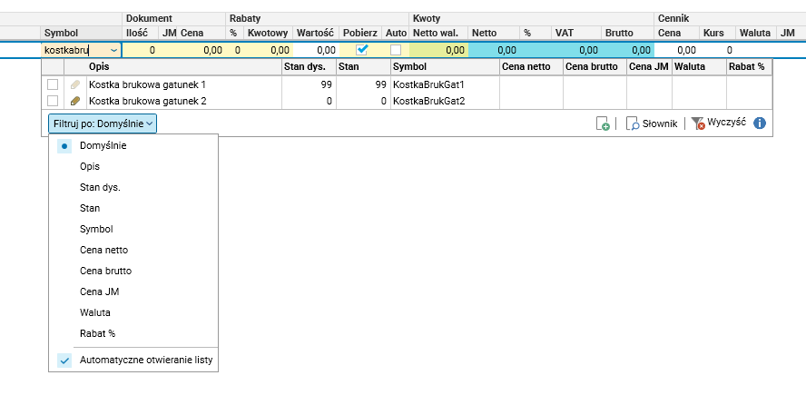 Każda lista wartości ma domyślny porządek przeszukiwania, ustawiony przez dostawcę oprogramowania, odpowiada mu opcja Domyślnie. Użytkownik może wybrać inne pole, np. Opis, wówczas lista będzie filtrowana po wybranym polu.