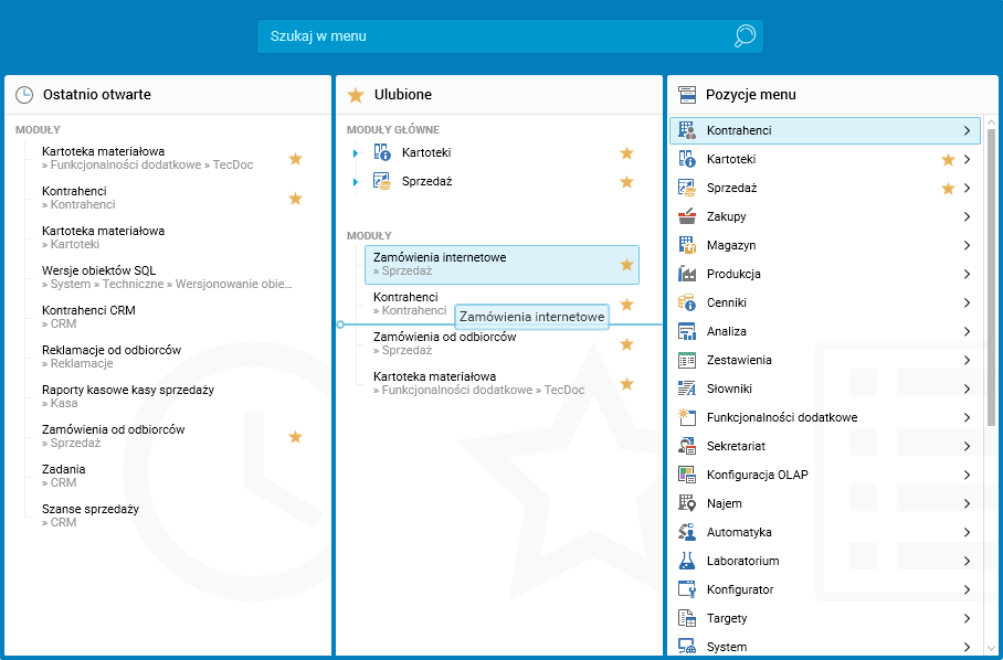 W menu głównym wprowadzono możliwość dodania elementu do ulubionych poprzez przeciągnięcie z panelu Ostatnio otwarte lub Pozycje menu oraz usunięcia z ulubionych poprzez przeciągnięcie i upuszczenie elementu na zewnątrz listy ulubionych.