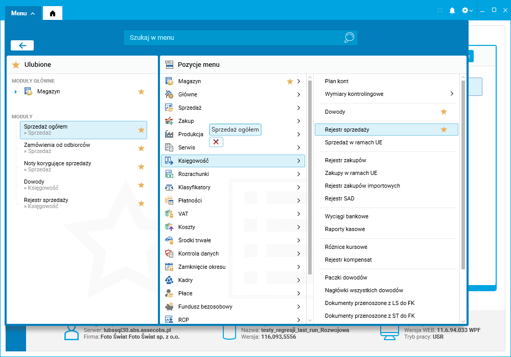 Usprawniono zarządzanie pozycjami ulubionymi w menu głównym i na ekranie głównym aplikacji. Kolejność elementów ulubionych można zmieniać poprzez przeciąganie ich na liście w ramach danej grupy (Moduły główne, Moduły itp.).