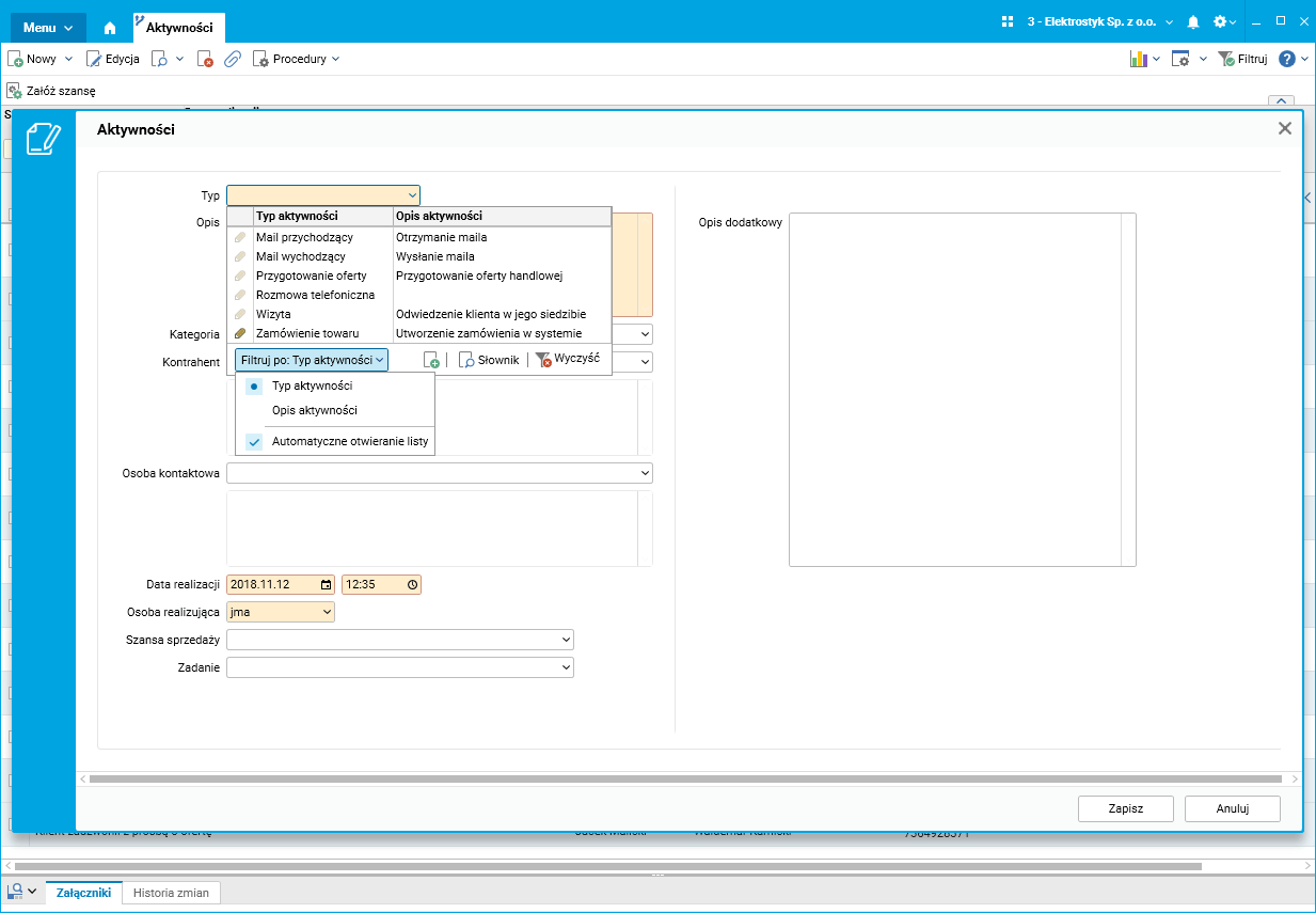 Jeśli w jakimś miejscu systemu automatyczne otwieranie będzie przeszkadzać, użytkownik może je wyłączyć, odznaczając opcję Automatyczne otwieranie listy dostępną na dole rozwiniętej listy. Ta zmiana będzie obowiązywać dla bieżącego użytkownika i bieżącej listy wartości.