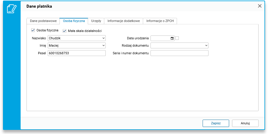 Rys. Formatka edycyjna danych płatnika, zakładka Osoba fizyczna
