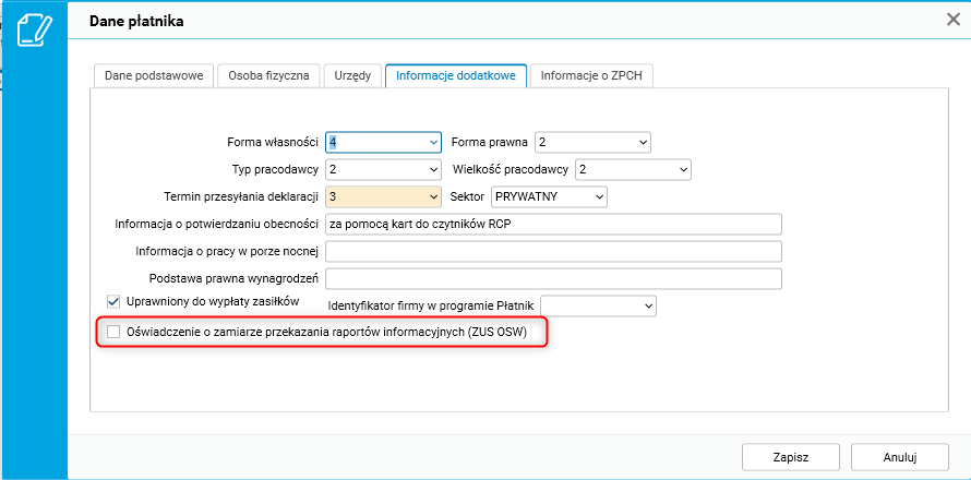W związku z zmianą przepisów w systemie zostało dodane pole Oświadczenie o zamiarze przekazania raportów informacyjnych (ZUS OSW) na zakładce Dane dodatkowe w słowniku Dane płatnika.