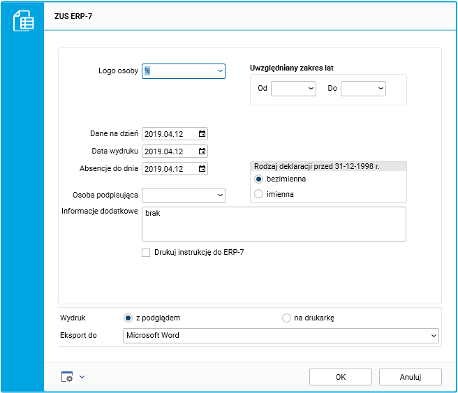 Parametry raportu ZUS ERP-7