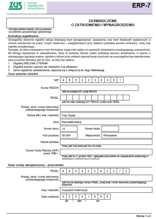 Rys. Przykładowe zaświadczenie ZUS ERP-7, strona 1