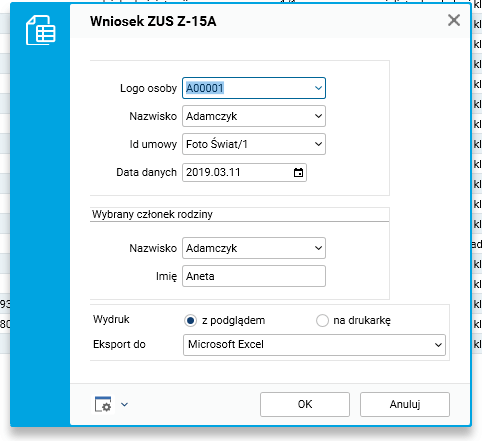 Rys. Parametry raportu Wniosek ZUS Z-15A