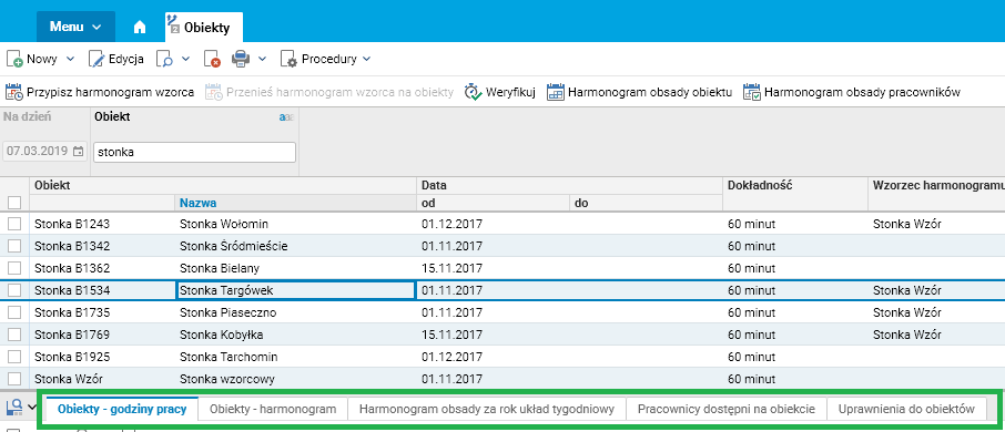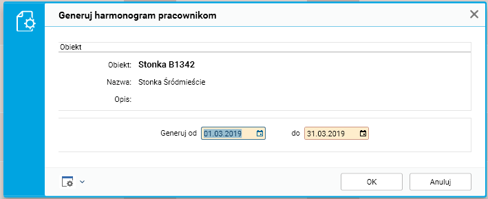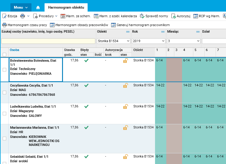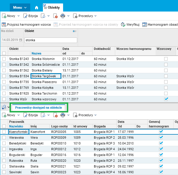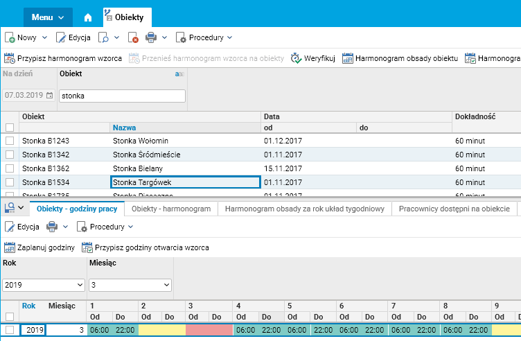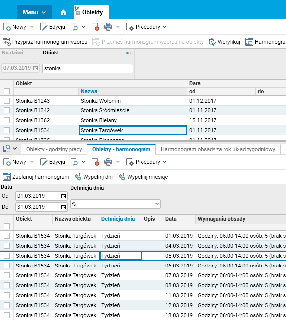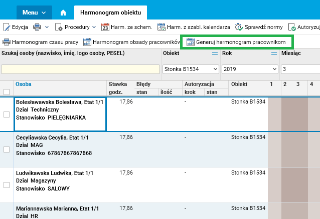 Procedura ta tworzy harmonogram dla pracowników związanych z wybranym obiektem we wskazanym okresie.